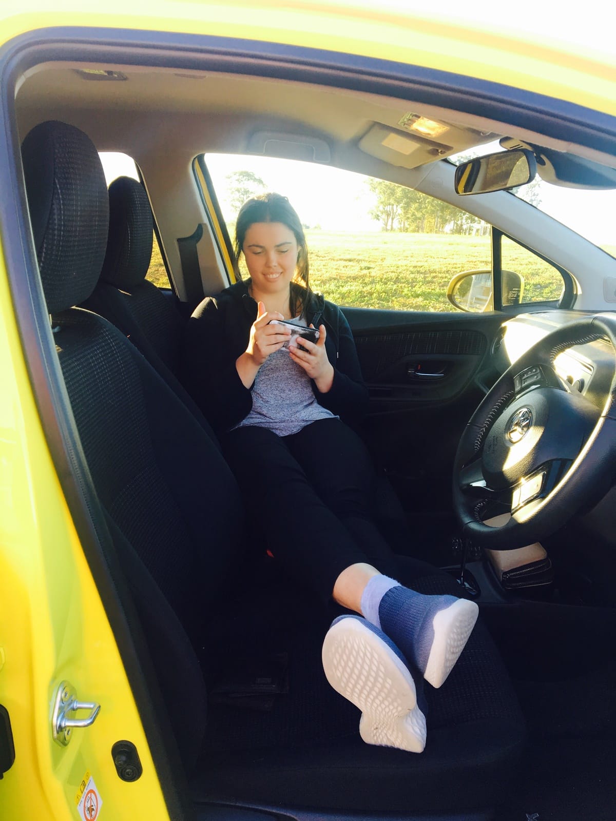Brianna- Inside is very comfortable for someone like me, great space for a little car. I was waiting in the car for 2 hours and was able to make myself very comfortable, fitting across the front seats as there is no middle console. I could sit back and watch my Netflix while I waited. Also had a great space to be able store items or your drinks and so on.